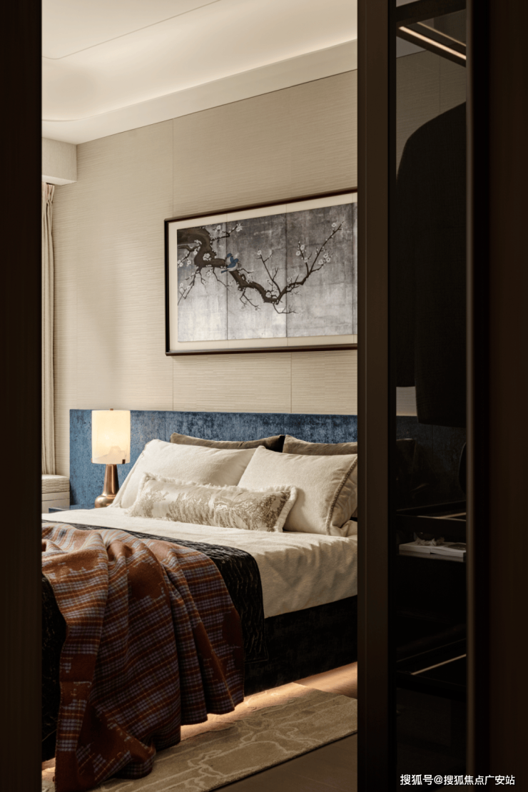 长辈房保持空间整体感的同时引入梅花、枝干等元素,梅坚而不摧,历经岁月依旧艳丽,这层美好的寓意同样被置于空间。