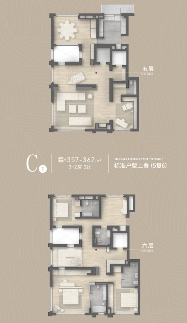 「沁风雅苑」项目1.2的容积率,整体由18栋6层楼的叠加组成,总套数101套,主力面积约311-360㎡叠墅,整体呈倾斜镜像状排列。