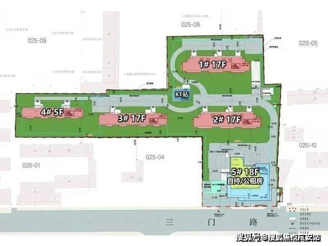 根据设计方案显示,项目拟建三栋17层商品住宅、一栋5层商品住宅、一栋18层公租房、自持租赁住宅及配套楼(其1-2层为菜场)和一栋1层的KT电站,并设置2层地下车库。在三门路设置机动车出入口、消防应急出入口及人行出入口。