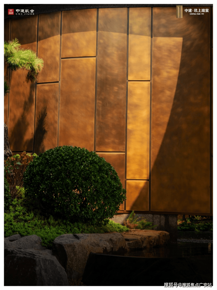 看似普通的铜墙,实际上出自非遗世家、正统传人朱炳仁之手,随时间流转,氧化形成的孔雀绿铜锈在曲面肌理上晕染出层峦叠嶂的写意形态,与前景景石形成虚实相生的当代山水意境。
