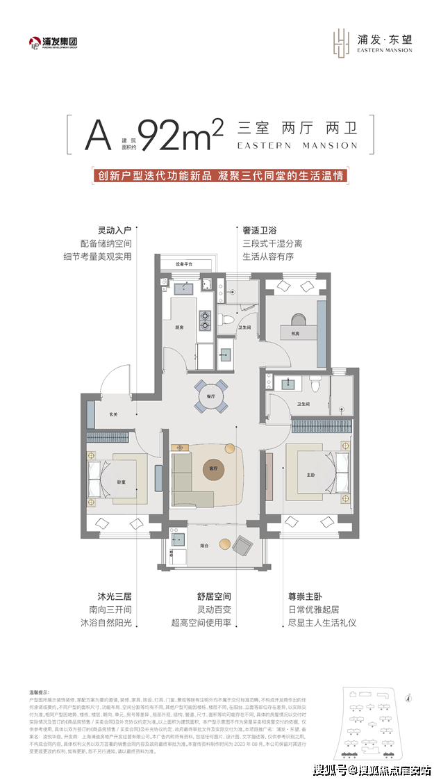 而浦发东望通过飞机户型设计、合理的功能规划等,做到了两个卫生间,缓解早高峰时“抢卫生间”的不便,却又不失尺度感