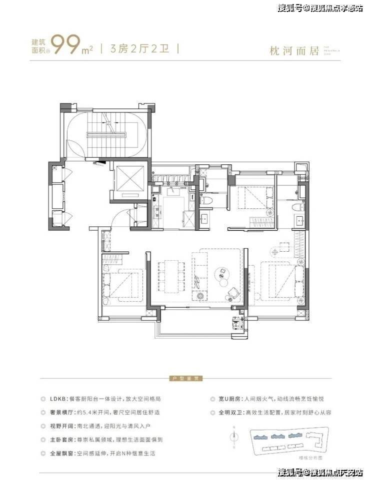 建面约99㎡滨水高层户型方正,功能性与尺度感兼得,在保证采光的同时,呈现开阔的空间场景。