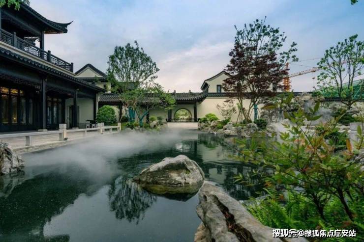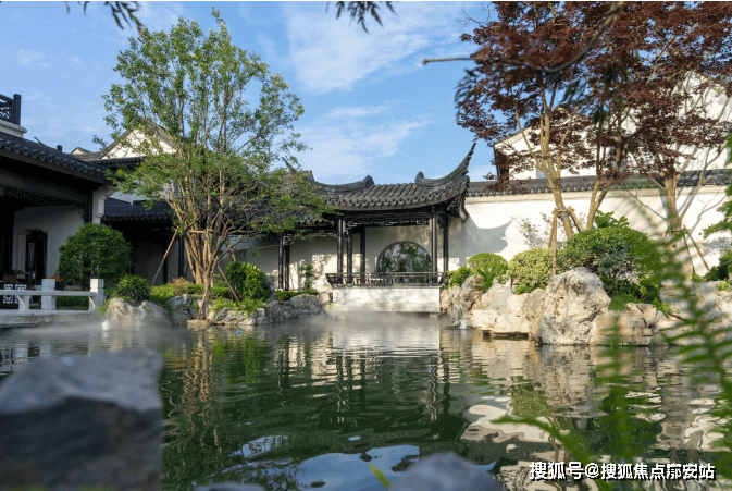 江南园林甲天下,苏州园林甲江南,比如像我们现在看到的园林布局,就是经典的苏州园林景观,讲究引水入园。 造景围绕着这片水景展开,空间上比较有层次感。近景是流水、堆石,中景是连廊、假山,远景是中式合院的院墙、屋檐。