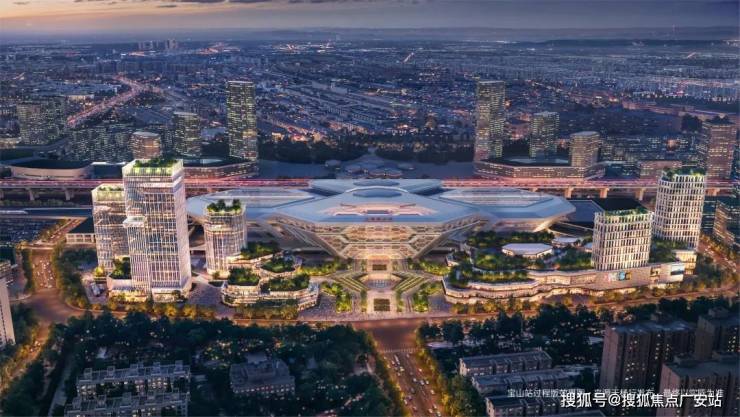 高铁宝山站枢纽总建筑面积约48万平方米。其中,站前广场建筑面积约39万平方米,含酒店、办公、商业综合服务等业态。