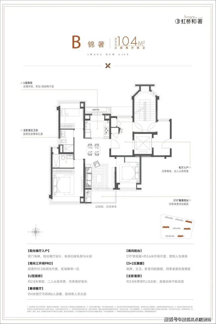 建面约104㎡3房,在建面94㎡小3房优点上,又进一步升级了尺度感,约10.3m的南向面宽,为室内带来了出众的采光面和尺度感,这个户型无论从实用性、尺度感,亦或是视野、采光、私密性来说,都做得相当优秀。