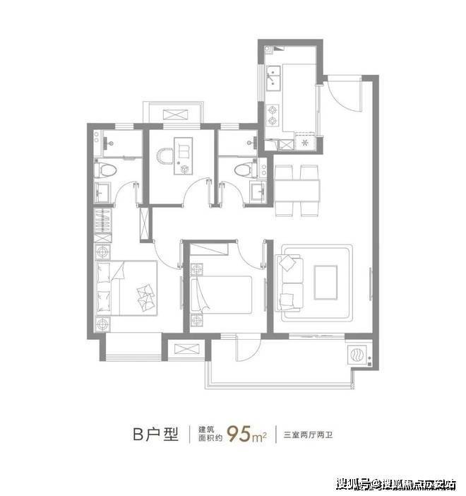 约95㎡的3房2厅2卫户型,这个户型的实用性太高了。能保证业主从二人世界到二胎家庭的全生命周期需求。