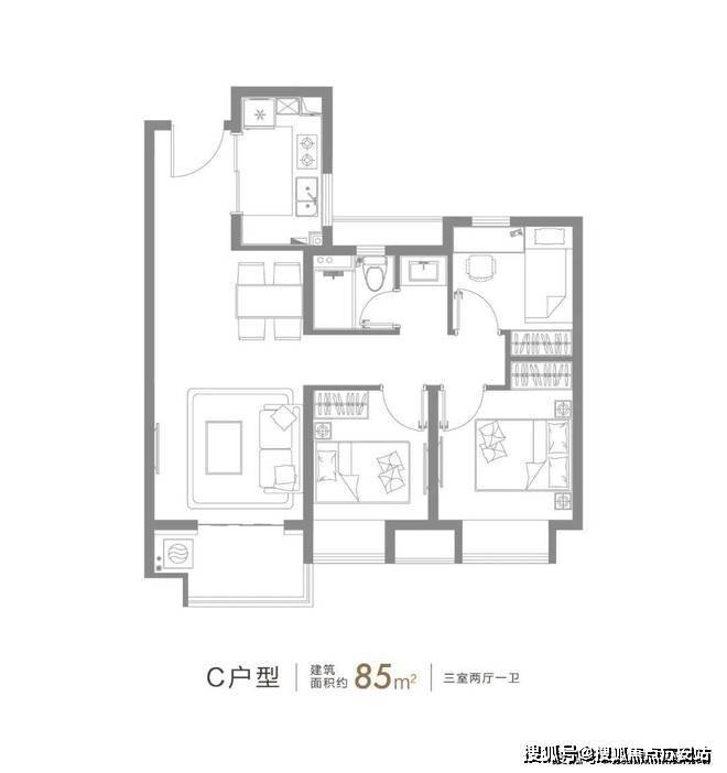 约85㎡的3房2厅1卫,三开间朝南+整体动静分离的设计,都保证了这个户型的居住舒适度。