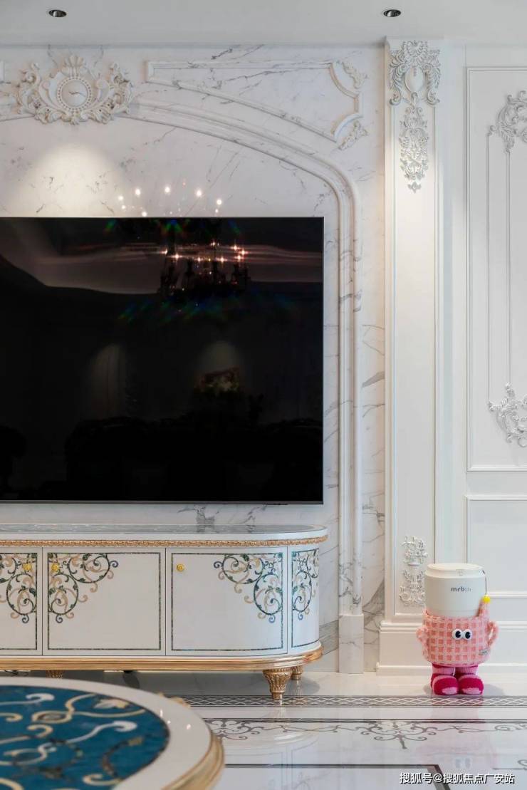 步入玄关,白色调的纯净映入眼帘,地面铺设卡拉拉白大理石瓷砖,以自然纹理呈现空间的柔和通透感。奢石与金属元素相互碰撞出复古情调,简洁的石膏雕花元素将法式独有的浪漫氛围拉满。