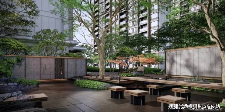 雅致石院与中庭古树相映,植物组团错落有致,营造出清逸山水园林之美,唤醒人们对林荫树下休憩闲聚的场地记忆。