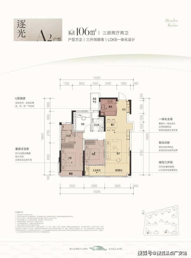 建面约106方A户型,三房两厅两卫: