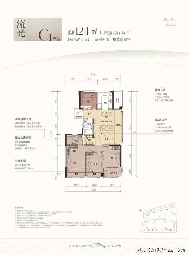 主力户型:106㎡、120㎡、124㎡、139㎡,部分楼栋两梯四户设计。