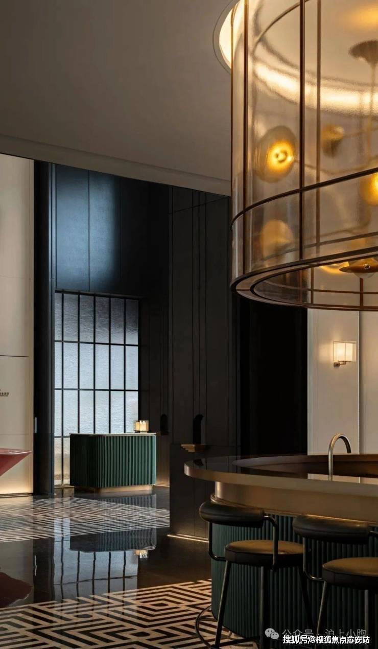 柔和的焦糖色光芒,将艺术玻璃的朦胧、拼花石材地板的复古韵味以及古铜与深色木饰面的肌理,准个凸显和描绘。