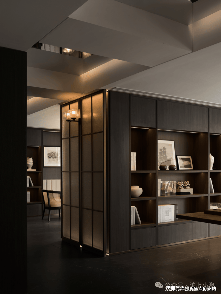 深色的木饰面与玻璃屏风的结合,木作与哑光金属的衔接,丰富材质的触感, 温馨的灯光照映下,整体的材质色彩搭配,令空间底色是如此的静雅。