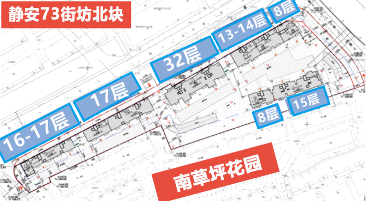 静安73街坊项目共分为南北两个地块,中间被现有的住宅隔开。