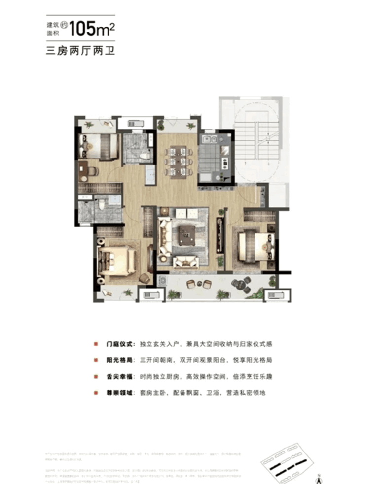 而建面约105㎡三房两厅两卫户型同样拥有独立玄关,并且空间感更为朗阔,三开间朝南,并且餐厅也设计有景观飘窗,真正做到了南北通透;一字串联的大客厅、南向阳台赋予家人更多互动空间;还有分散布局的卧室互不打扰。