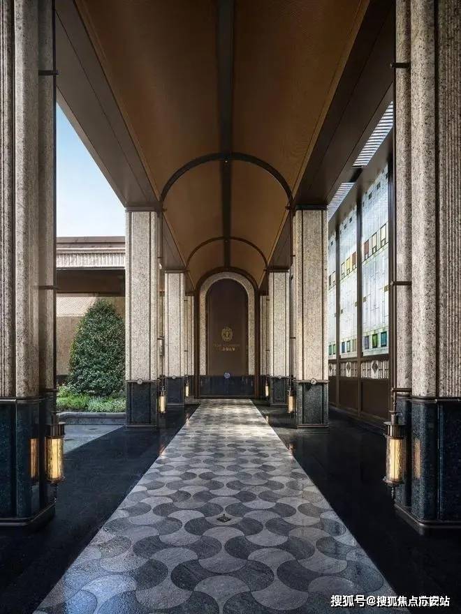 走在约30米的艺术连廊,第一时间想到的就是繁花电视剧里出现过的和平饭店拱形廊道.但建发·海阅首府取其精髓,融合现代工艺重新演绎,更具时尚感.