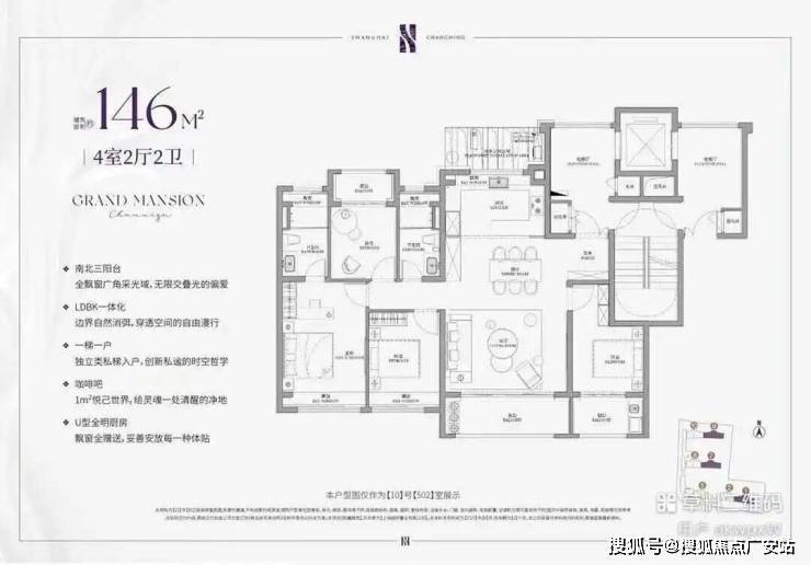 建面约143㎡的4房户型,类一梯一户的设计,每一户都有一个面积约8㎡的独立采光电梯厅空间;四开间朝南+大宽厅,采光效果爆棚;通过LDKB一体化设计,形成一个近50㎡的客餐厅空间,极大提升空间场景的可能性;卧室也采用了酒店化套房设计,主卧贯穿南北套房设计,南北皆有飘窗。