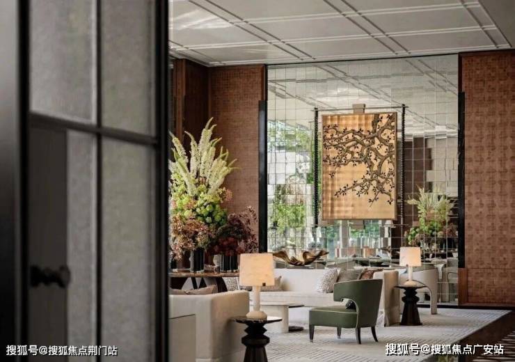 在生活馆里,你能看到发光石材的背景墙,瑰丽酒店同款壁灯、昂贵的黄虎眼奢石制作的接待台、同源瑰丽的风泥客石屏风、手工敲荔枝面……