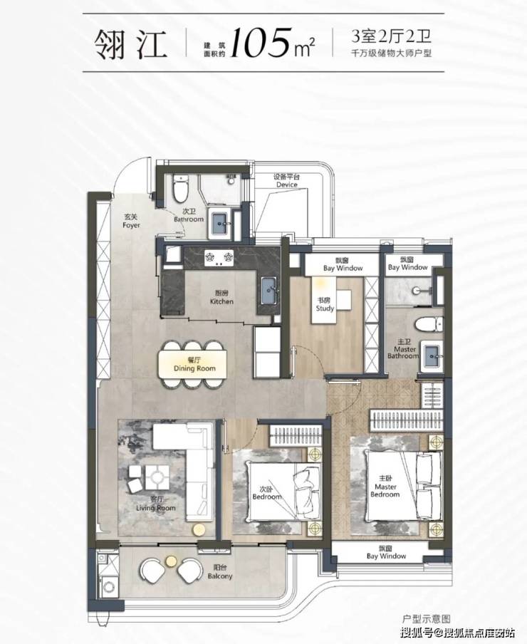 超拓设计:三开间朝南+横厅,主卧套房配置独立衣帽间及270°转角飘窗,空间利用率大大提升。