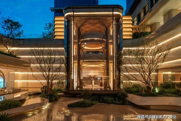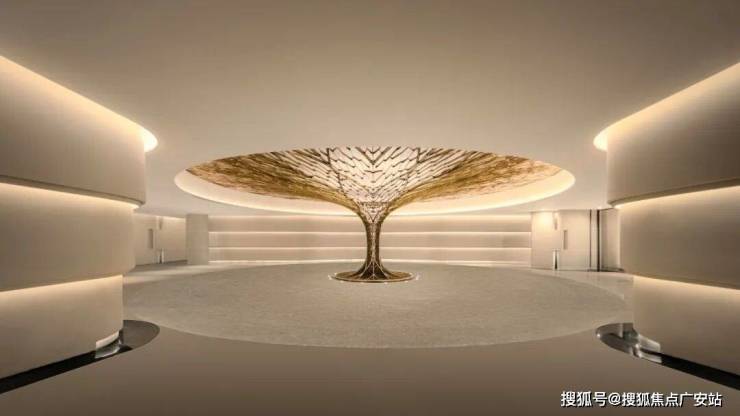 公区大量运用米白或米黄色石材,随处可见温润曲线元素,高级感在空间无界流动;巨大的扇形华盖,景墙如滚滚波浪;三层观景环厅“生机之亭”,四根巨柱呈现向上生长的旺盛生命力;还有中央车站价值百万的“黄金树”…