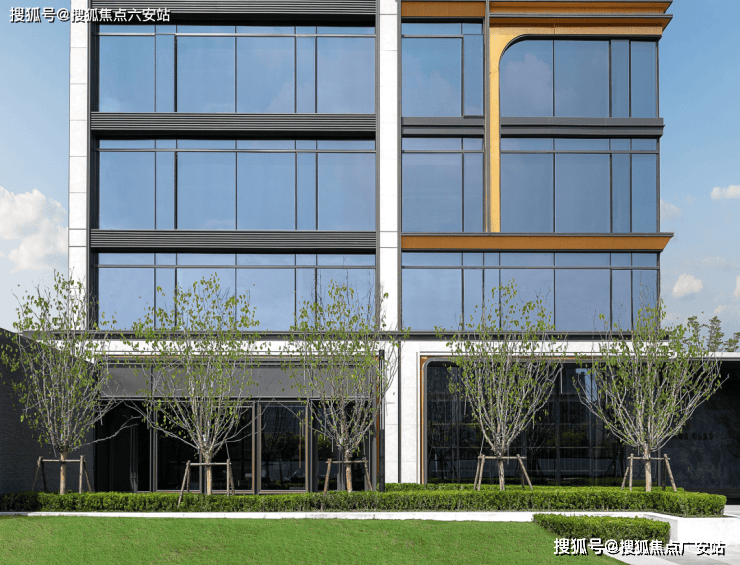 铝板、大面积玻璃与金属框线组成了璞云东方的“第一眼心动”,尤其是工艺精巧又极为吸睛的R角金属线框,犹如一道金色飞虹,让人一眼难忘。