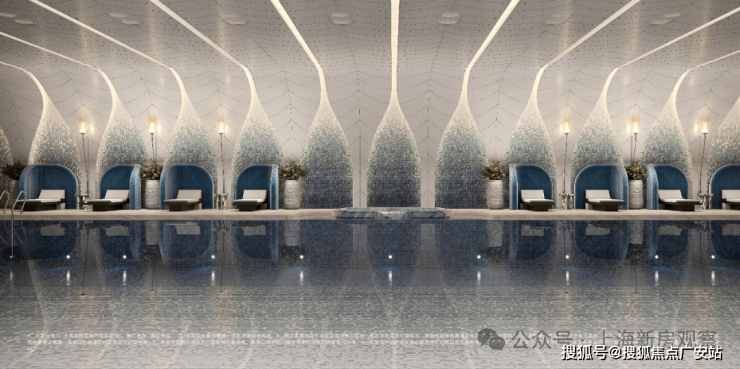 从示范区的打造上来看,保利打造了度假感氛围!采用了国际度假酒店的打造手法,从门头、具有海蓝色的水景、海岛感的花园植物,丰富艺术品的植入,以及非常亮眼的上海首个浮雕水景艺术卡座,营造轻松、惬意的氛围,像这样的松弛场景在项目中数不胜数,给到客户强烈的度假感和松弛感。