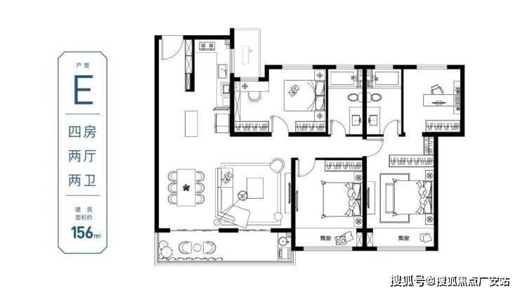 E户型 阔境四房/超大客厅建筑面积约156㎡/4房2厅2卫