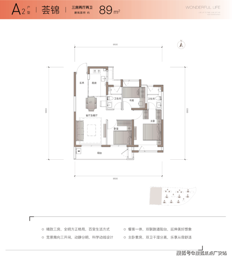 项目主力户型建面约89m²3房2厅2卫,近10米南向面宽,约6.3米的超大阳台打造更舒适的空间尺度感