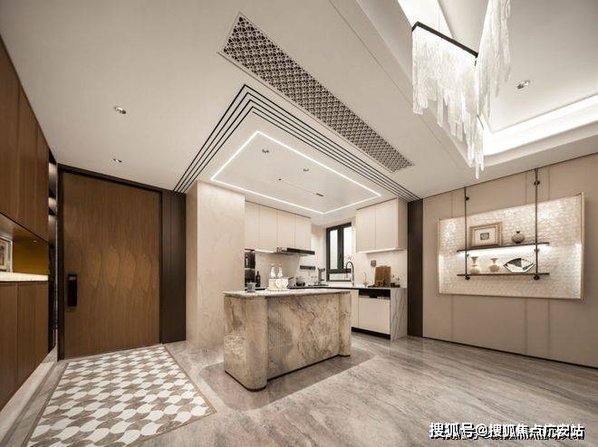 走进海上·清和玺的厨房,墙面岩板通铺,视觉效果超棒。