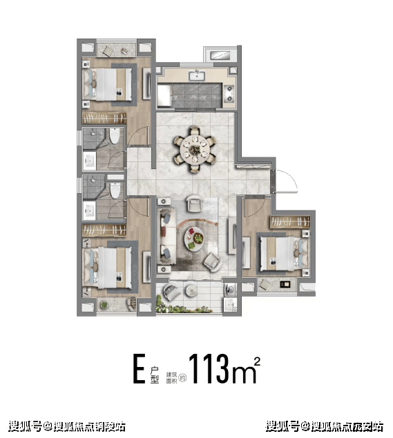 也有建面约113m²舒适性三房,南北通透;飞机户型,房间分列两侧互不打扰;卧室空间也相对更大、更舒适。