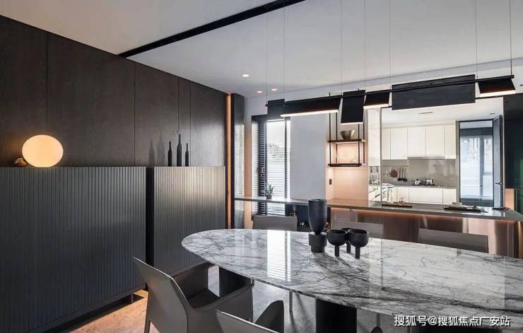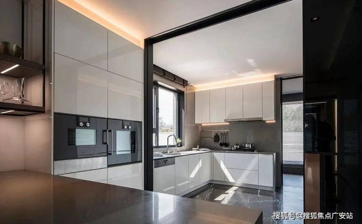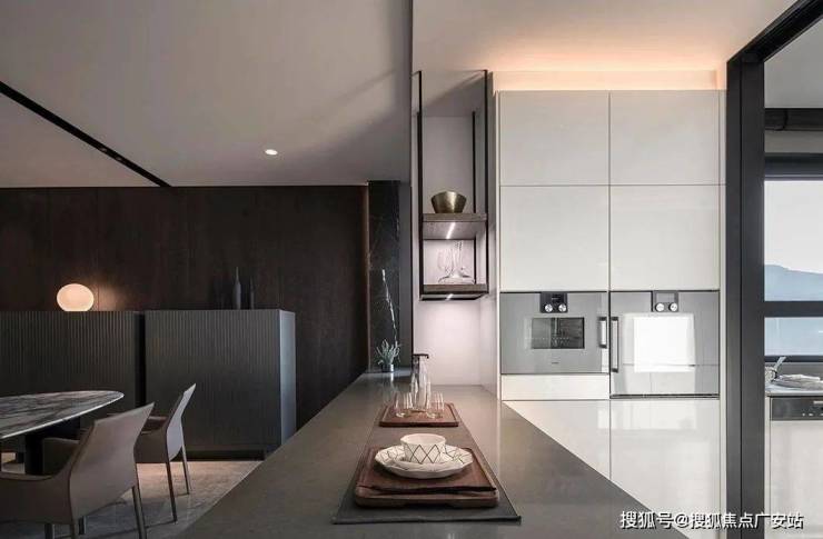 开放式的厨房空间减去了厚重的墙面隔屏也减轻了视觉的重量感,大面积的开窗设计,更将大平层的采光优势、迷人景色完全引入室内。