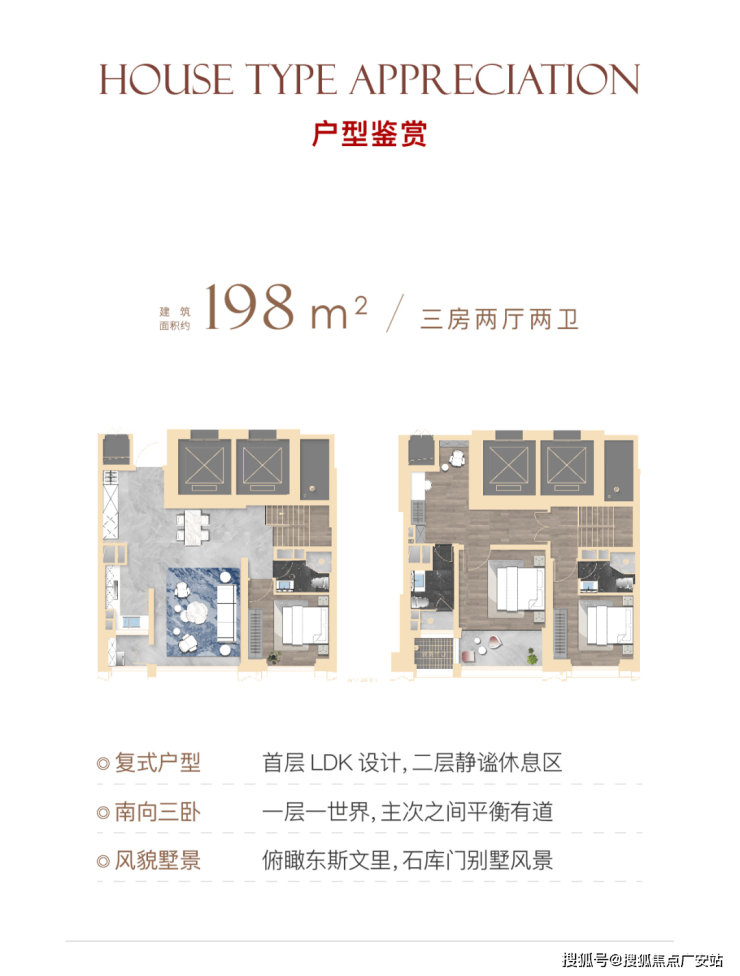 该户型只有极致景观楼层才有,南向景观面达约13.5米,无遮挡,南向两个卧室均有很好的视线通达性。
