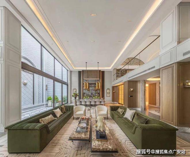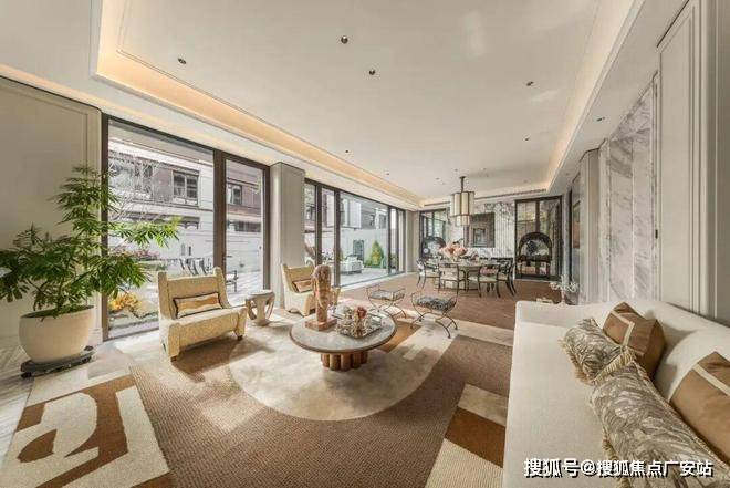 以274㎡的排屋户型为例,一层设置客厅、餐厅、厨房与长辈房,客厅采用“横厅”设计,搭配大面积的落地玻璃窗,将室外园林景观引入室内;