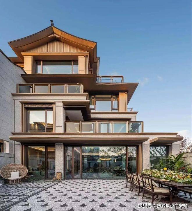 建筑外立面以米白色石材为主,搭配深咖色金属线条与木质格栅,既保证了建筑的质感与耐久性,又增添了中式建筑的温润气息。