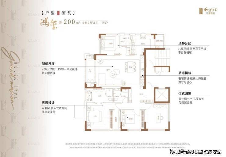 户型为约200㎡四房三卫大平层,采用“四叶草”布局,卧室分布四角,私密性强;