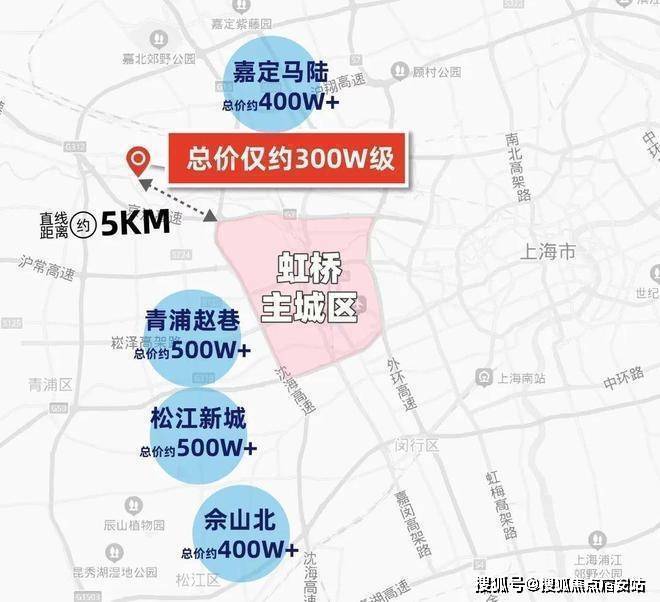 通过百度地图测距我们发现:安亭距离虹桥主城区直线距离仅约5公里,但总价仅约300万级!