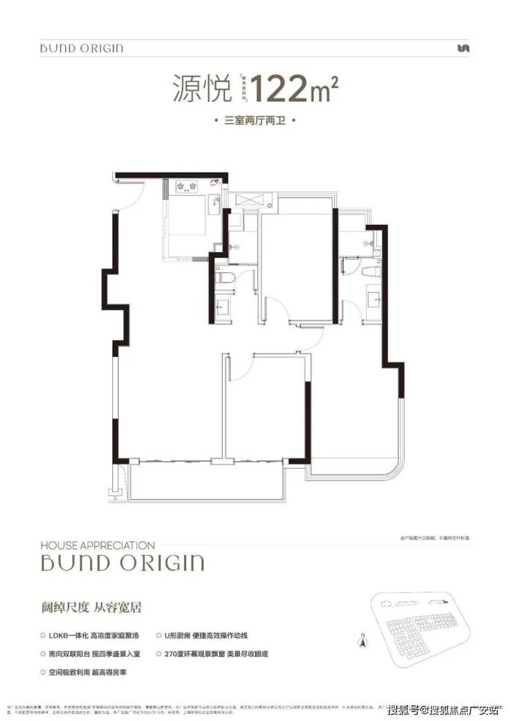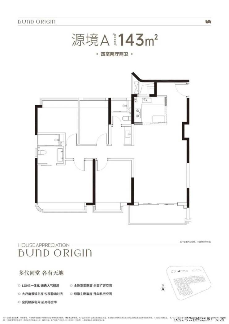 A户型是4房2厅2卫格局,三开间朝南+LDKB一体化+全卧室带飘窗+主卧套房设计+动静分离,居住功能性更强。