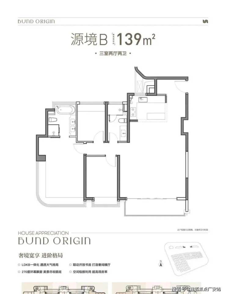 B户型是3房2厅2卫格局,三开间朝南+LDKB一体化+奢阔宽厅+全卧室带飘窗+主卧套房设计+动静分离+主卧270度飘窗,舒适度更高。