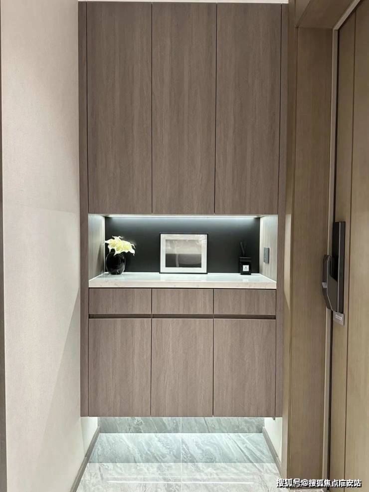 入户玄关更是设计了大量的收纳空间。底部架空,可以用来摆放鞋子,并设置有嵌入式灯带,整体的氛围感拉满。