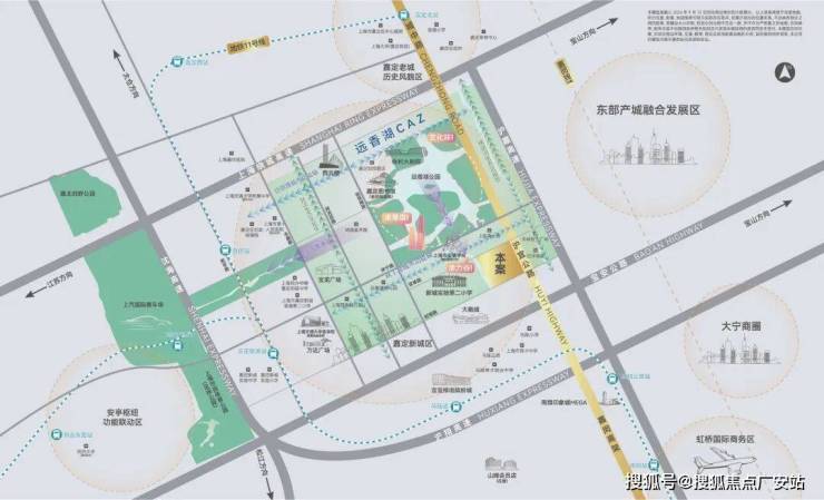 一条沪宜公路,贯连嘉定南北,通过这条大动脉往南能迅速接驳沪嘉高速、嘉闵高架,通达大宁、虹桥、真如等城市CBD。往北则链接远香湖CAZ,聚集嘉定新城的城市资源精粹。