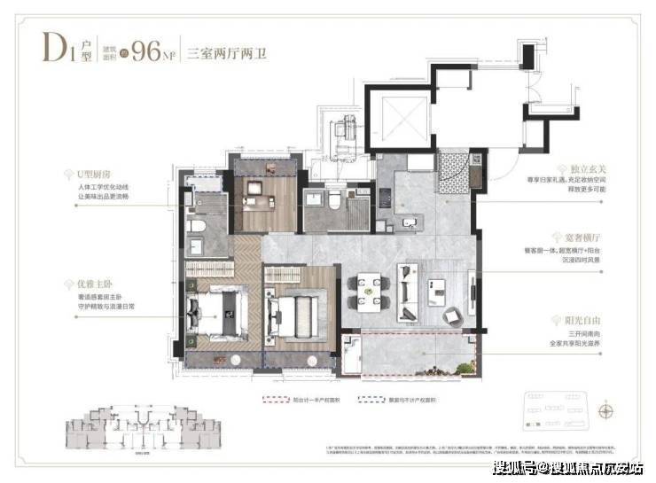 项目建面约103㎡3房同样是 三开间+大横厅 的布局,但尺度上更进一步。而且灵动空间更多, 全屋飘窗+南向观景阳台 ,提升性价比的同时也增强户型对外的延展性。