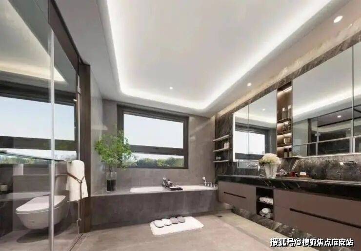主卧豪华套房,面宽约5.4m,带衣帽厅和奢华卫浴体系。值得一提,还有一个南向次卧套房,卫生间也是朝南设计,避免暗卫。