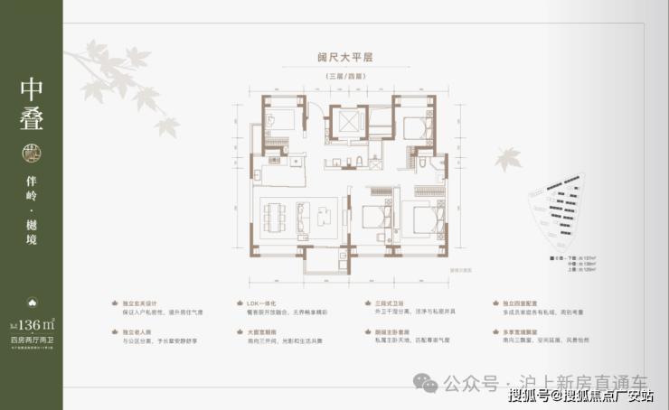 建面约137㎡下叠,四房两厅三卫全能格局,非常适合二娃家庭以及三代同堂。