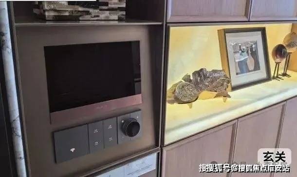 入户这座铸铝门,质感厚重;通顶玄关柜,内置消毒精灵,奢石把手+奢石台面更显海派温润气质,玄关地面都铺上了海上·清和玺的logo拼花,小小玄关做到了既实用又美观。