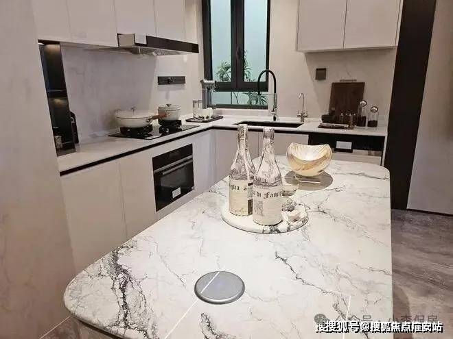 柜门白色烤漆面板,抽屉分区也都是帮大家细致划分,如多功能调味拉篮+谷物抽+碗碟拉篮等。岛台上配置可升降插座,铝合金抽屉,石材背景板的金属开放格实用性很强。