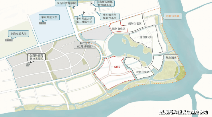 项目西侧是紫竹高新技术园区、北面是交大和华师大校园,以及紫竹基础教育园区,包含幼儿园至高中全龄段教育配套。