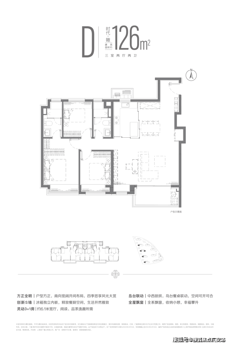 建面约126m²三房两厅两卫户型,南向3+1面宽横厅设计,让空间更加随心而变。主卧双台盆配置,用空间拥抱自然中的无限自在。
