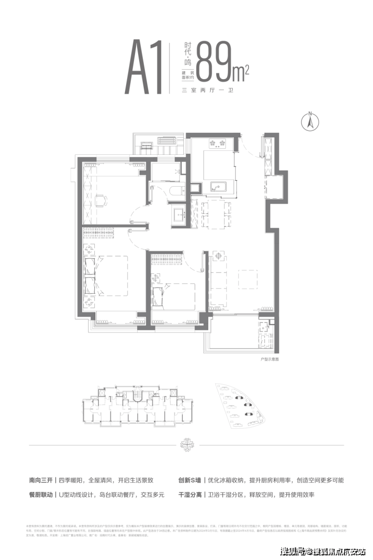 建面约89m²三房两厅一卫户型,LDKB一体化设计,南向三开间布局,全明空间设计。让四季流转于生活之中,用自然营造生活的惬意。