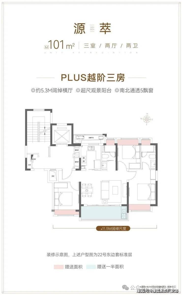 101㎡ 三房两厅两卫:643–698 万,5.3 米横厅、11.5 米南向面宽、三开间朝南