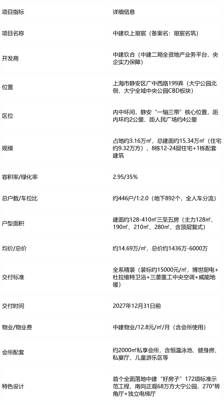中建玖上琅宸是内中环间罕见的公园奢宅+央企精工标杆,适合追求城央公园生活、看重中建“好房子”品质与顶奢精装,同时希望享受静安大宁成熟配套的高端改善家庭。